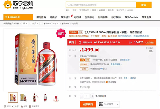 苏宁易购1499元购飞天茅台在10月1日0点准时开始预约。e公司记者观察,9月30日之前,在苏宁易购搜飞天茅台只显示茅台年份酒或者非500ml装酒,9月30日晚间,已有标价为1499元的2019年500ml飞天茅台预约页面。