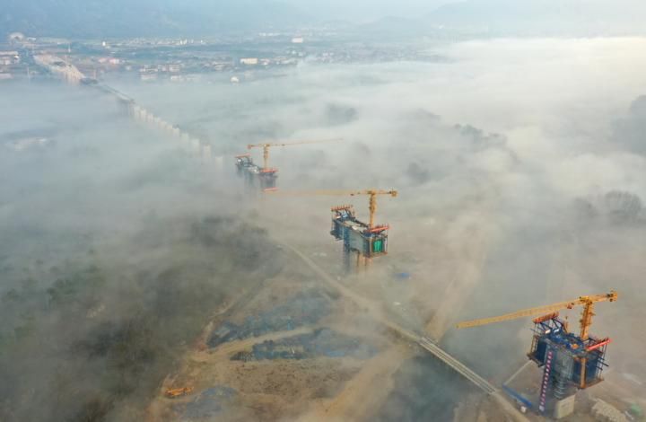 首页 浙江台州:杭温铁路仙居特大桥在云雾中延伸 2022-01-04 06:51:50 分享 2022年1月2日,建设中的浙江省台州市杭温铁路仙居县特大桥云雾缭绕、若隐若现,铁路建设者正在抓紧施工,以确保工程质量和进度。王华斌摄(人民图片网)