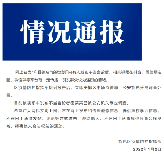 对此,2022年1月2日晚上,陕西西安市鄠邑区委宣传部官方公众号发布通报称,网上名为“户县馍店”的微信群内有人发布不当言论后,相关视频在抖音、微信朋友圈、微信群等平台有一定传播,引发群众较为强烈的情绪。