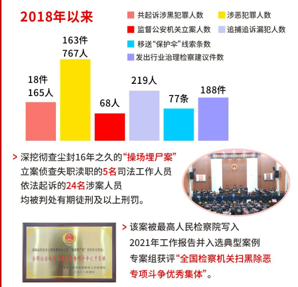 湖 南省人民检察院官方微信公众号消息:2021年12月31日,湖南怀化市人民检察院检察长徐百坚在该市第六届人民代表大会第一次会议上作工作报告。徐百坚 在报告中提到,检察机关深挖彻查尘封16年之久的“操场埋尸案”,立案查处失职渎职的5名司法工作人员,依法起诉的24名涉案人员均被判处有期徒刑及以上 刑罚。该案被最高人民检察院写入2021年工作报告并入选典型案例,专案组获评“全国检察机关扫黑除恶专项斗争优秀集体”。