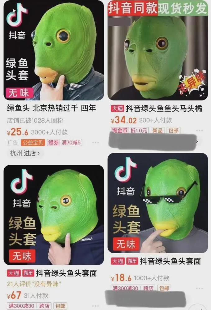 淘宝平台上,售卖绿鱼头头套的商家不在少数,售价在18元到30元之间,还有个别卖到了60块钱以上。1688也有不少制作头套的工厂,绿鱼头款的售价在10元左右。不止是火爆全网的绿鱼头,很多专门卖乳胶制品和玩具商家还推出了各式各样的头套,售价都差不多。