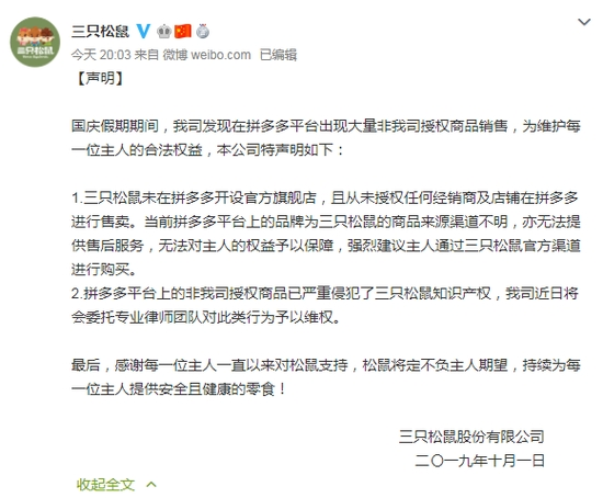 炣燃科技10月3日讯 近日,三只松鼠在其官微上发布声明称,平多多平台出售未经授权产品,该公司从未在拼多多开设旗舰店。