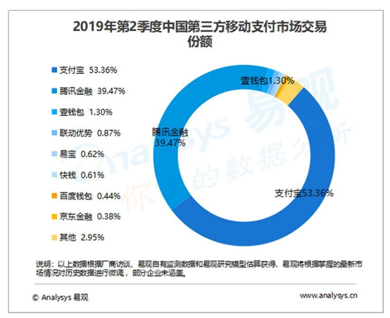 易观近日发布的报告显示,2019年第二季度,移动支付市场前三名的位次保持不变,但份额继续发生变化。支付宝二季度继续以53.36%的份额保持市场第一的排名。