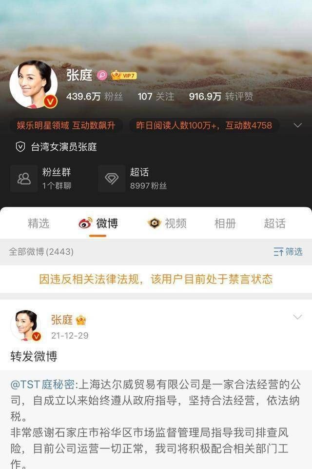 1月2日,演员、TST庭秘密实控人张庭的抖音账号被禁止发布作品,违规原因显示“不符合社区规范”,将于2022年1月16日解封。