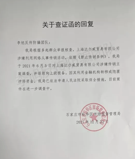 12月29日上午,石家庄市裕华区市场监督管理局回应称:此传销组织从2013年开始,辖区内涉案人员多,但是具体人数不便透露,涉案金额比较巨大。该工作人员还介绍称,从目前的调查来判断,这个传销组织属于一种经营性传销行为,还不足以构成诈骗型的传销。目前,此案已进入财务审计阶段。目前张庭林瑞阳只是转发了公司的回应,并未就此事道歉。