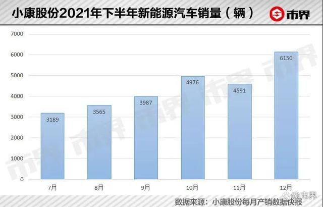 小康股份发布的产销数据显示,2021年7月至12月,公司旗下的新能源汽车销量分别为3189辆、3565辆、3987辆、4976辆、4591辆、6150辆,整体销量有所增长。需要指出的是,这些数据包括了小康股份旗下东风风光、东风小康、金康汽车等子公司新能源汽车产品销量。相形之下,吉利汽车、长城汽车2021年11月的新能源汽车销量就高达16162辆和16633辆。