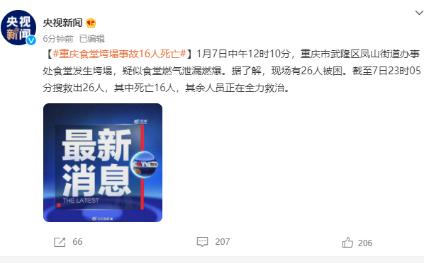 首页 重庆武隆区食堂垮塌事故16人死亡 2022-01-08 08:42:48 分享 「本文来源:央视新闻」1月7日中午12时10分,重庆市武隆区凤山街道办事处食堂发生垮塌,疑似食堂燃气泄漏燃爆。据了解,现场有26人被困。截至7日23时05分搜救出26人,其中死亡16人,其余人员正在全力救治。举报/反馈