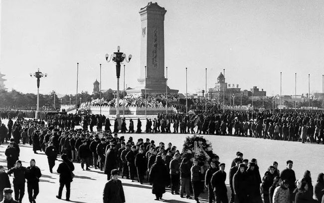 运送周恩来遗体的灵车驶过长安街,北京百万市民自发伫立街道两旁默哀致意。