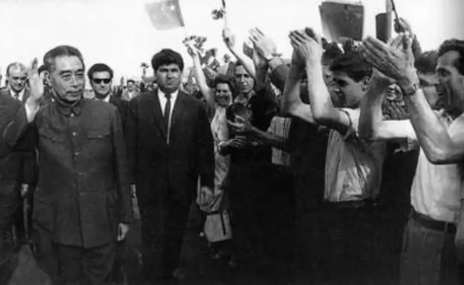 1965年7月,周恩来和陈毅出国访问归来后在新疆维吾尔自治区视察。这是他们抵达乌鲁木齐时,接受维吾尔族青年献花。