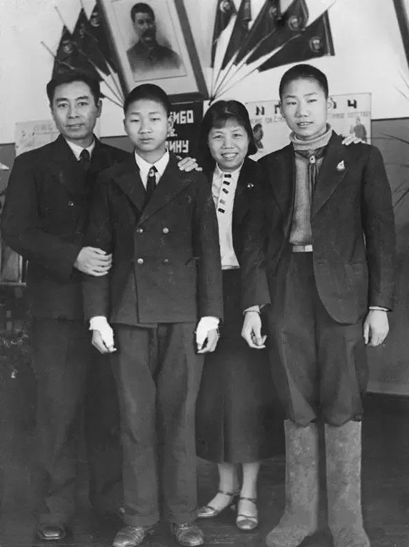 △1940年,周恩来与邓颖超在莫斯科国际儿童院,与毛岸英(右)与毛岸青合影。