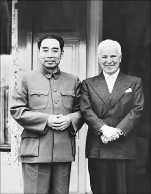 △1954年7月18日,周恩来在日内瓦宴请英国著名艺术家卓别林。7月21日周恩来将亲笔签名的照片赠送卓别林。