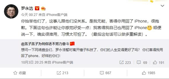 有网友发微博称:“想问一下网络蝗虫们,罗永浩暂时离开锤子科技了,你们的人生变得更好了吗? 你们害得我用回了iPhone,好样的你们!”