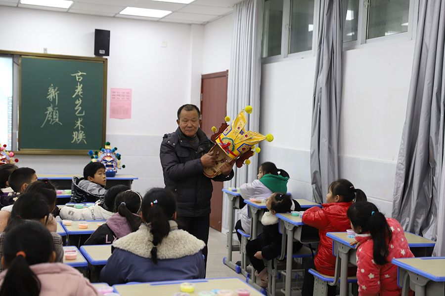 年近七旬的戴修义在校园里为孩子们讲解傩文化。郎溪县委宣传部供图