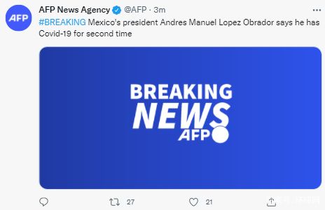 首页 墨西哥总统新冠检测呈阳性,系第二次感染新冠 2022-01-11 09:07:15 分享 【环球网快讯】路透社刚刚消息,墨西哥总统洛佩斯新冠病毒检测呈阳性。洛佩斯 资料图法新社消息则称,墨西哥总统称他是第二次感染新冠。2021年1月24日,墨西哥总统洛佩斯曾宣布其新冠检测呈阳性。他当时在社交媒体上表示症状很轻,正接受治疗。法新社推特截图