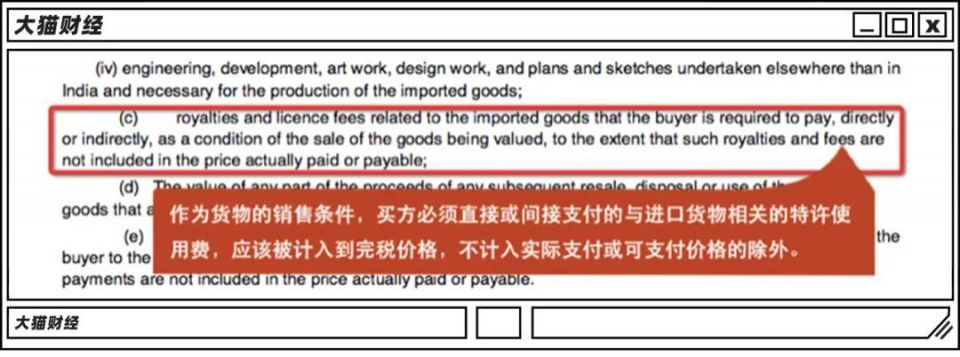 他们直接搬出了具体的法律依据,特许使用费需计入商品的完税价格,据此,印度方面觉得偷税漏税实锤了。