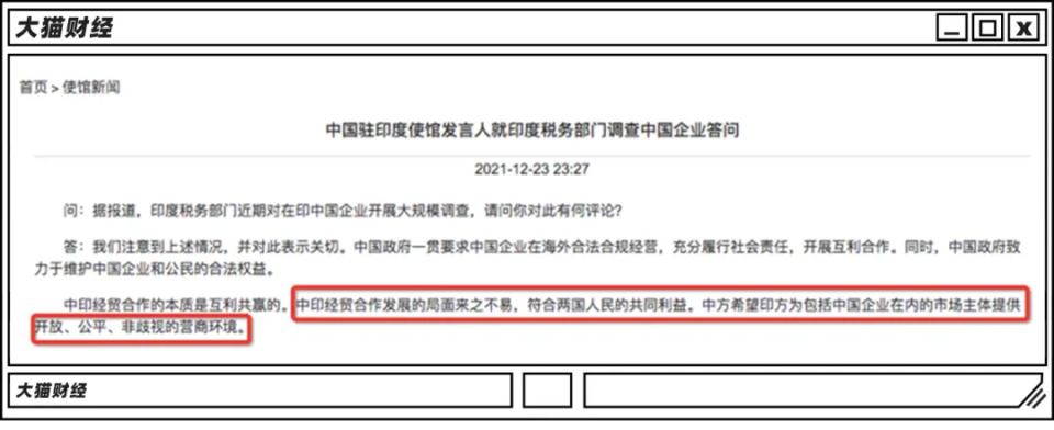 对此,中国驻印度大使馆还专门做了一次答问,专门提到了印度的营商环境。