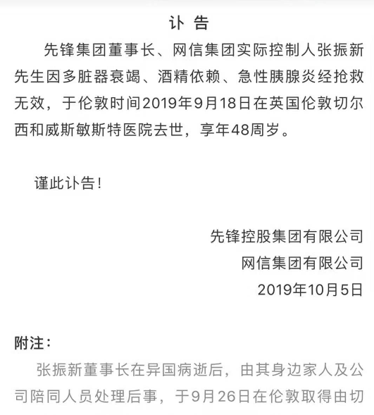 炣燃科技10月6日讯 10月5日,先锋集团和网信集团联合对外发布讣告称,集团实际控制人张振新因多脏器衰竭、酒精依赖、急性胰腺炎经抢救无效,于伦敦时间2019年9月18日在英国伦敦切尔西和威斯敏斯特医院去世,终年48周岁。