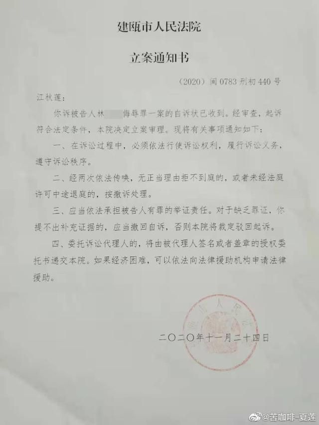 对林某的刑事自诉案,当地法院已于2020年11月立案 图片来源:江秋莲个人微博