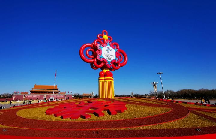 2022年1月17日,北京冬奥会日益临近,“精彩冬奥”主题花坛装点天安门广场。宋晓峰摄(视觉中国)