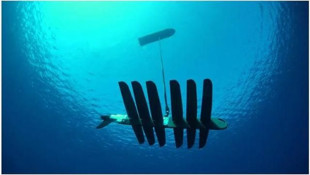 老刘查阅资料后发现,波浪滑翔机是一种无人化海上观测平台,可在不同的海况条件下对海洋环境进行持续、有效的观测。最早研发设计波浪滑翔机的是美国公司Liquid Robotics,2009年研发完成全球第一款 ——Red Flash,该波浪滑翔机采用双体设计的海浪推进式无人水面艇,由水面和水下两部分组成,水面有一个表面浮体平台,水下的“滑翔机”部分通过电缆系在平台下方数米处。浮体和滑翔机协同工作,水下滑翔机上的“水翼”随着波浪作用上下旋转,从而将海洋表面的波浪能转化为水面平台前进的动力。由于波浪能在海洋表面长期存在,因此能够从根本上解决常规海上观测作业平台对能源的需求问题。