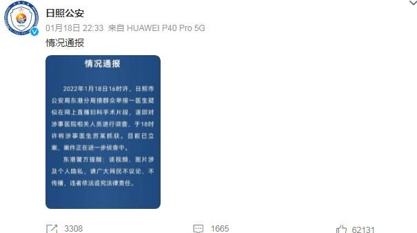 据“日照公安”微博号1月18日深夜消息,2022年1月18日16时许,日照市公安局东港分局接群众举报一医生疑似在网上直播妇科手术片段,遂即对涉事医院相关人员进行调查,于18时许将涉事医生厉某抓获。目前已立案,案件正在进一步侦查中。