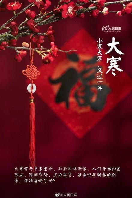 科创 今日大寒,还有10天就是除夕了 2022-01-20 10:40:36 分享 ①今日10时39分迎来二十四节气中最后一个节气“大寒”;②大寒大寒,防风御寒,注意持续保暖,避免感冒;③天冷气燥,皮肤易干燥瘙痒,除保暖外,日常多饮水,避免沐浴过频;④大寒一到年味渐浓,下一站就又是一个春天了。你准备好了吗?做好防护,咱们平安过年!来源:人民日报
