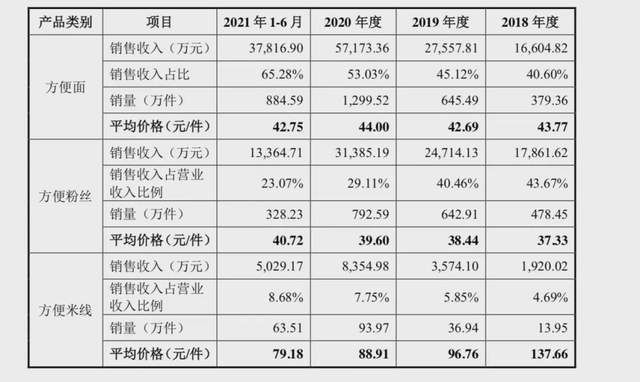 以2021年上半年为例,主打红油面皮的方便面品类营收3.8亿元,占比达65.28% ,但其他版块的销量表现平平,方便粉丝营收为1.3亿元、占比23.07%,方便米线营收仅0.5亿元、占比8.68%,自热食品营收更是只有964万元、占比1.66%。