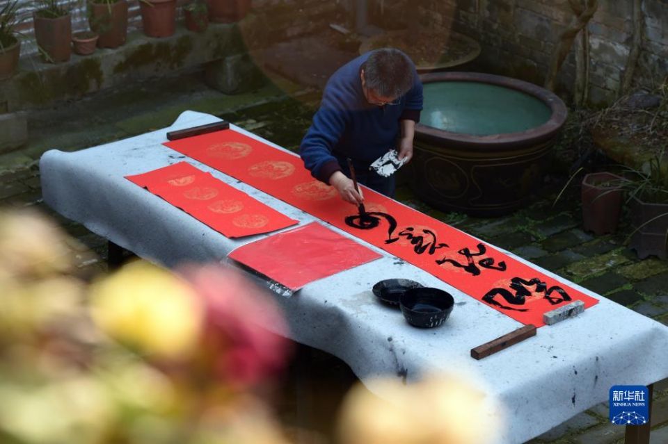 首页 徽州年味 2022-01-21 09:55:44 分享 黄山市徽州区西溪南镇的居民在写春联(1月19日摄)。安徽黄山地区有着深厚的文化底蕴,保留着许多传统民俗。春节将至,白墙黑瓦的徽州古街和古村落里“年味儿”越来越浓,人们按传统习俗准备鲜花,写春联,制作芝麻糖、萝卜丝饼、虎头花馍等食物,喜迎新年。新华社记者 周牧 摄