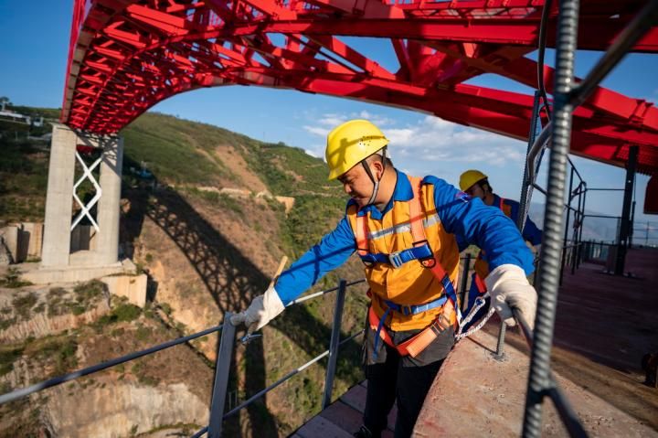 今年28岁的施鹏彬是昆明铁路局普洱基础设施段工务维修技术中心的一名桥隧工,日常工作是对中老铁路控制性工程元江双线特大桥进行检修。元江双线特大桥长约832米,最高的3号桥墩达154米,相当于50多层楼房的高度。红色钢桁梁飞架在灰白的桥墩上,远处望去,跨越元江的大桥在群山间格外壮美。