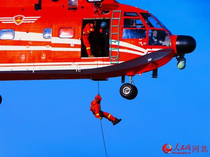 人民网石家庄1月22日电 “索降准备、开始……”四级消防士孙思源快速滑行,随即抽出安全绳、解开锁扣,一系列动作干净利落,随着一个展开双臂的手势成功完成索降。
