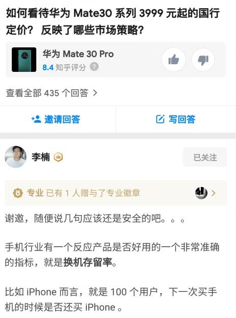 上述言论是李楠在知乎上回答相关网友的提问时候说出的。李楠表示,手机行业有一个反应产品是否好用的一个非常准确的指标,就是换机存留率(直接体现在用户对品牌的忠诚度上)。比如iPhone而言,就是100个用户,下一次买手机的时候是否还买iPhone。