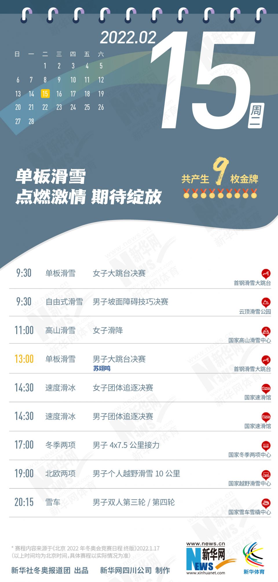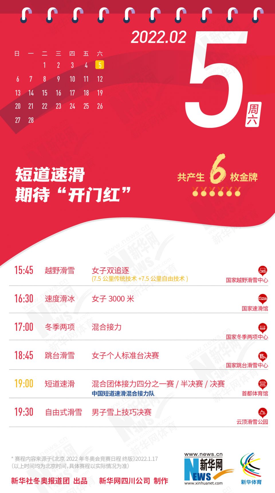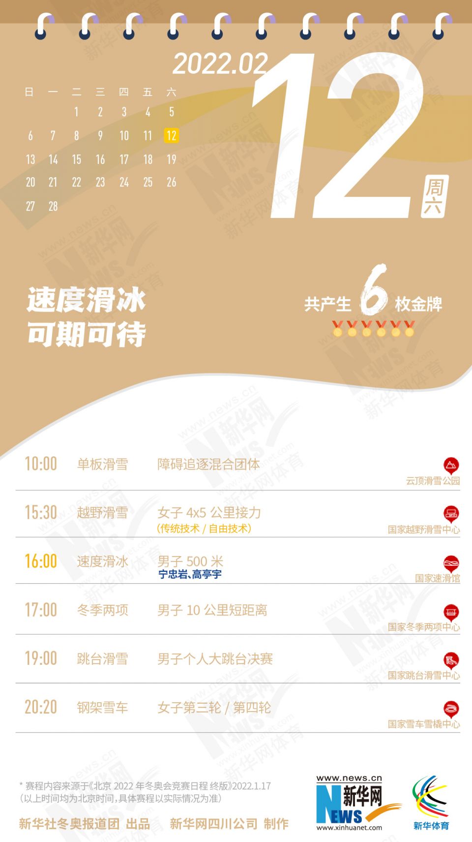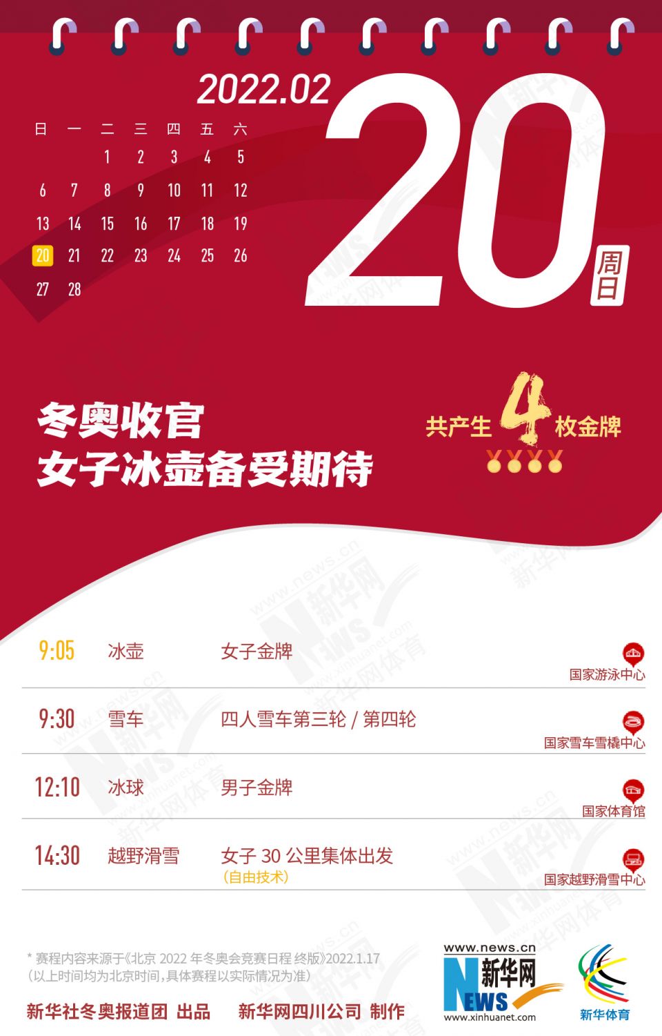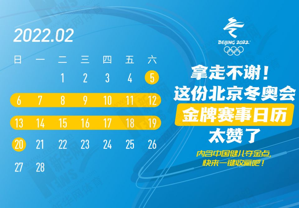 科创 拿走不谢!这份北京冬奥会金牌赛事日历太赞了 2022-01-26 09:11:51 分享 北京2022年冬奥会在盼望中临近,运动员已蓄势待发,体育迷也翘首以盼。关键时刻,怎可打无准备之“仗”?为此,小编精心汇总好北京冬奥会每日重点赛事,助你精准观赛。出品人:刘健、许基仁、钱彤策划:周红军、刘加文、周杰监制:侯大伟、倪宏、展鹏、吴俊宽统筹:李旭、王钒、丁峰文案:刁文静、王梦、王剑冰设计:包雨刚新华社冬奥报道团 出品新华网四川公司 制作