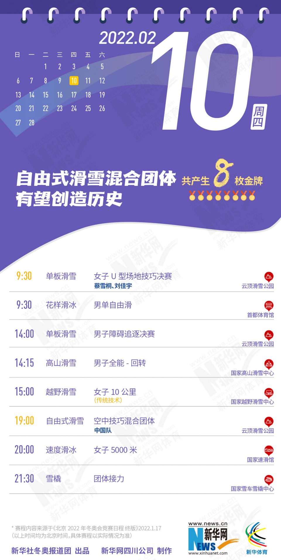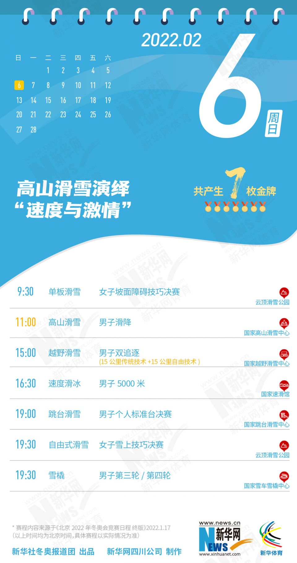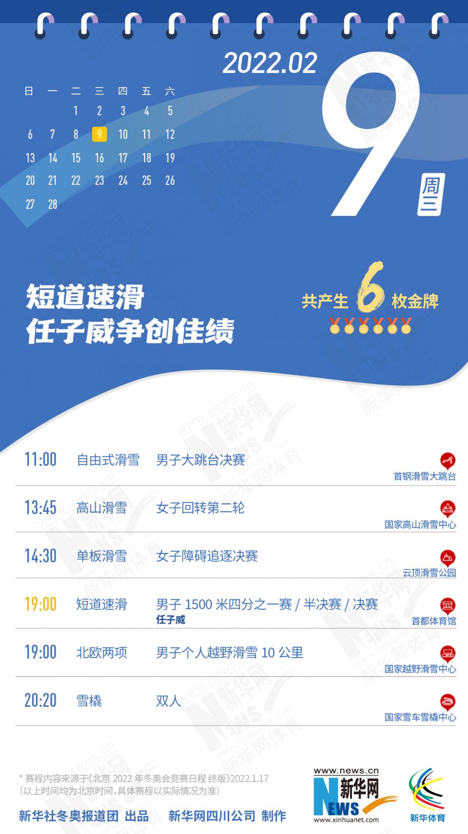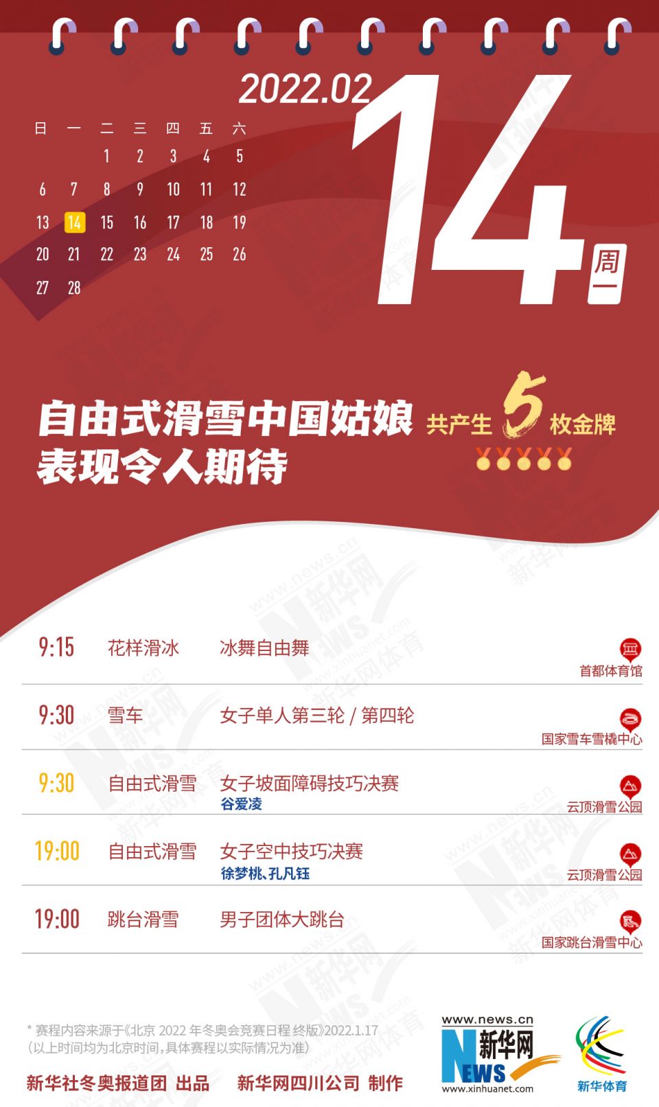科创 拿走不谢!这份北京冬奥会金牌赛事日历太赞了 2022-01-26 09:11:51 分享 北京2022年冬奥会在盼望中临近,运动员已蓄势待发,体育迷也翘首以盼。关键时刻,怎可打无准备之“仗”?为此,小编精心汇总好北京冬奥会每日重点赛事,助你精准观赛。出品人:刘健、许基仁、钱彤策划:周红军、刘加文、周杰监制:侯大伟、倪宏、展鹏、吴俊宽统筹:李旭、王钒、丁峰文案:刁文静、王梦、王剑冰设计:包雨刚新华社冬奥报道团 出品新华网四川公司 制作