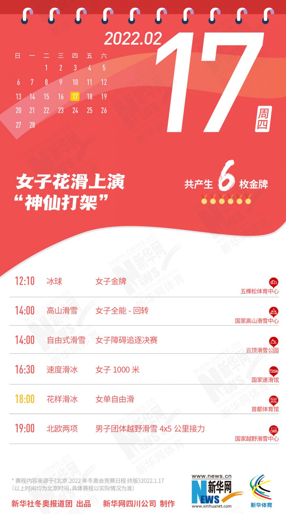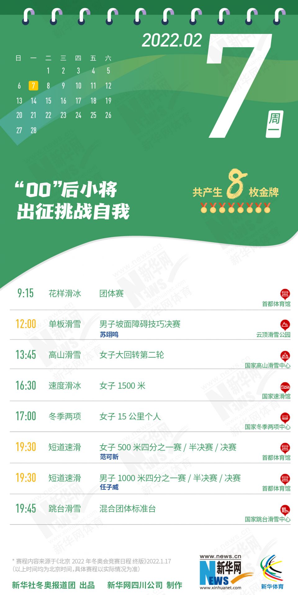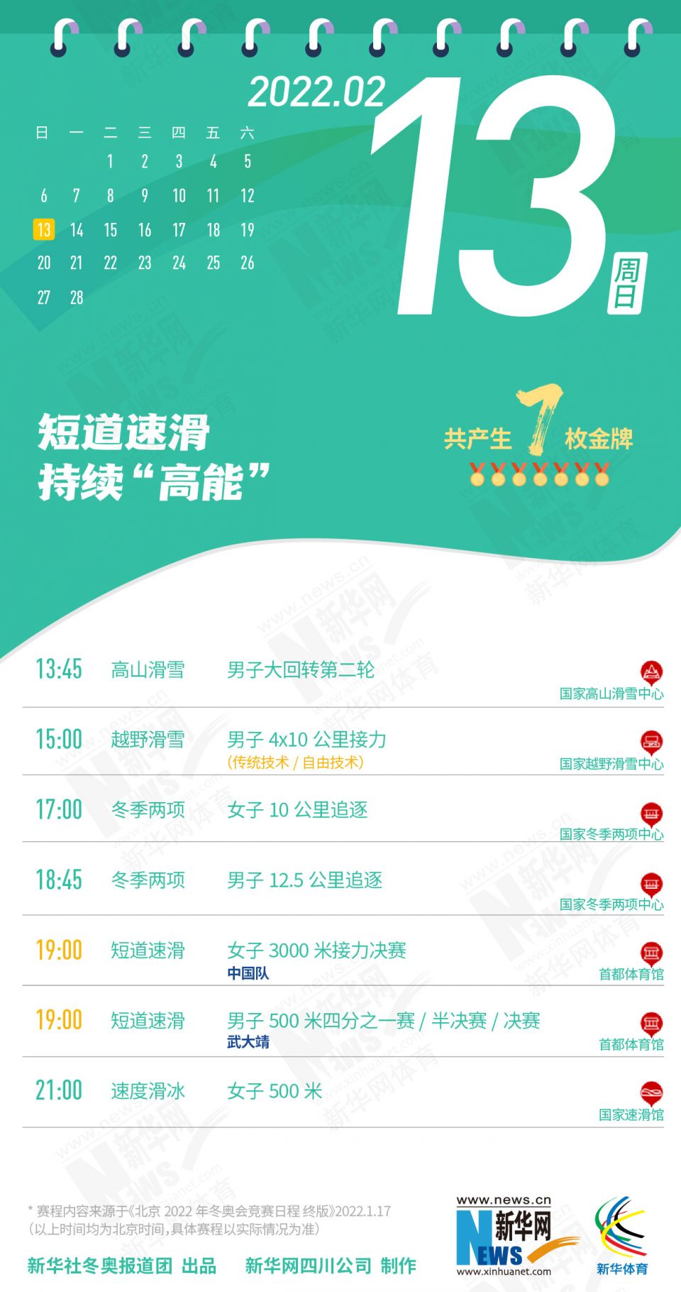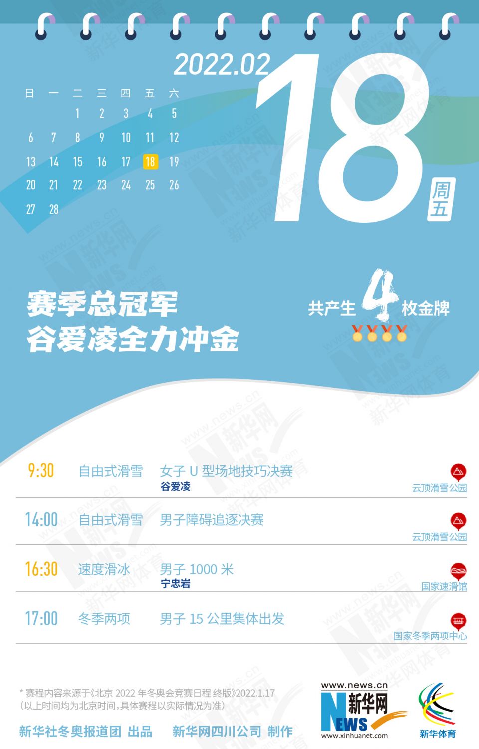 科创 拿走不谢!这份北京冬奥会金牌赛事日历太赞了 2022-01-26 09:11:51 分享 北京2022年冬奥会在盼望中临近,运动员已蓄势待发,体育迷也翘首以盼。关键时刻,怎可打无准备之“仗”?为此,小编精心汇总好北京冬奥会每日重点赛事,助你精准观赛。出品人:刘健、许基仁、钱彤策划:周红军、刘加文、周杰监制:侯大伟、倪宏、展鹏、吴俊宽统筹:李旭、王钒、丁峰文案:刁文静、王梦、王剑冰设计:包雨刚新华社冬奥报道团 出品新华网四川公司 制作