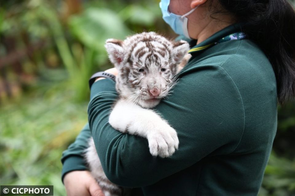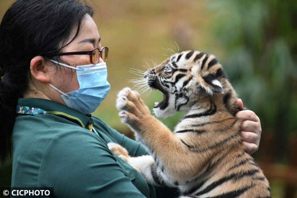 ↑在广州长隆野生动物世界,保育员携幼虎亮相新虎区落成仪式。CICPHOTO/许建梅 摄