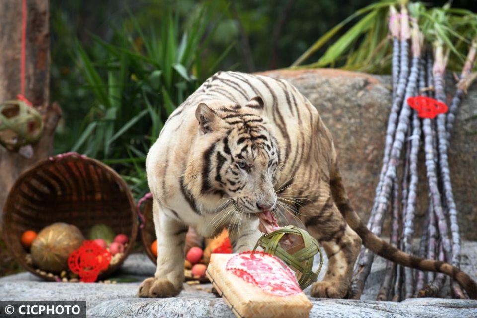 ↑在广州长隆野生动物世界新虎区内,白虎在“新居”拆取食物盲盒。CICPHOTO/许建梅 摄