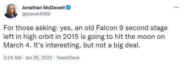 乔纳森·麦克道尔在自己经过认证的推特账户上写道:“对那些提出疑问的人说:是的,2015年留在高轨道上的一枚老猎鹰9号火箭的第二级将于3月4日撞上月球。”这证实了冥王星项目(Project Pluto)的比尔·格雷(Bill Gray)的预测。