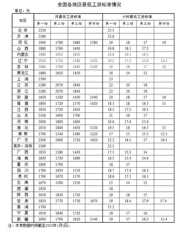 全国各地区最低工资标准情况(截至2022年1月1日)。来自人社部网站