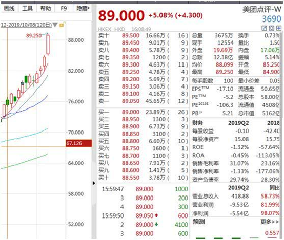 10月8日,美团点评股价再创新高,盘中最高涨至89.25港元。截至收盘,美团报89港元,涨幅5.08%,总市值5162亿港元(约合661亿美元),排在阿里(4382亿美元)和腾讯(3.09万亿港元,约3940亿美元)之后,为中国第三大互联网公司,超过京东(418亿美元)、拼多多(366亿美元)和百度(353.66亿美元)。