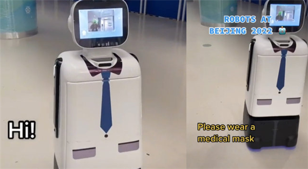 据网络报道,近日,参加北京冬奥会的加拿大运动员分享了在冬奥村偶遇智能机器人的视频。视频显示,当拍摄者跟机器人打招呼时,机器人随即说道“请佩戴医用口罩”,拍摄者表示谢谢后,机器人离开了。