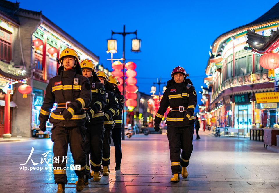 2022年1月31日,除夕,内蒙古呼和浩特市玉泉区大召消防救援站的消防员在大召历史文化旅游街区值守。丁根厚摄(人民图片网)