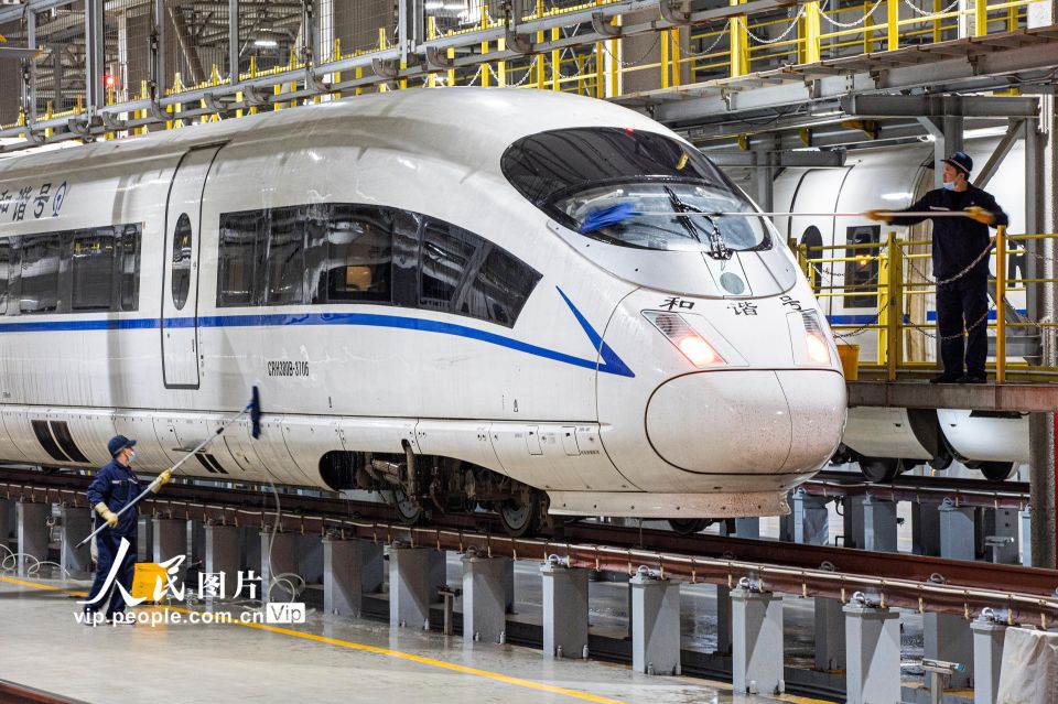 2022年1月31日,除夕夜,中国铁路西安局集团有限公司西安动车段检修库内,仍有一群动车组机械师坚守工作岗位,认真检查着每一列返回的动车组,守护春运动车组列车安全运行。王曙天摄(人民图片网)
