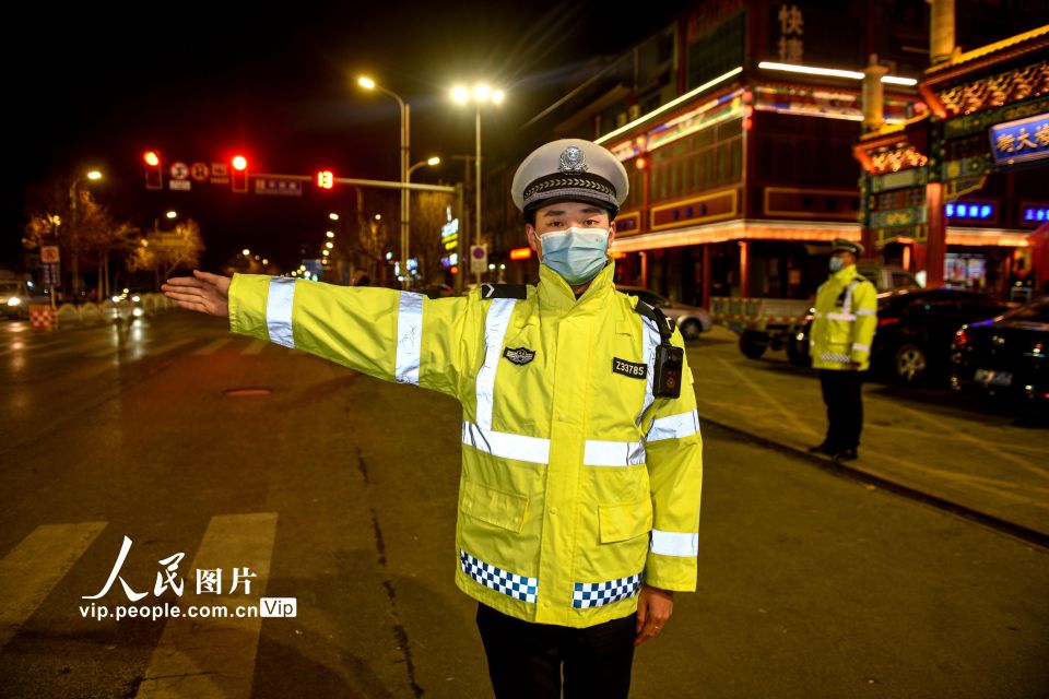2022年1月31日,除夕夜,河北省涿州市公安交警、特警坚守岗位,为城市保畅通奋战在第一线,他们忙碌在检查站、拥挤路段、繁华街道、大街小巷等,让人们过一个安定祥和的春节。刘永兴摄(人民图片网)