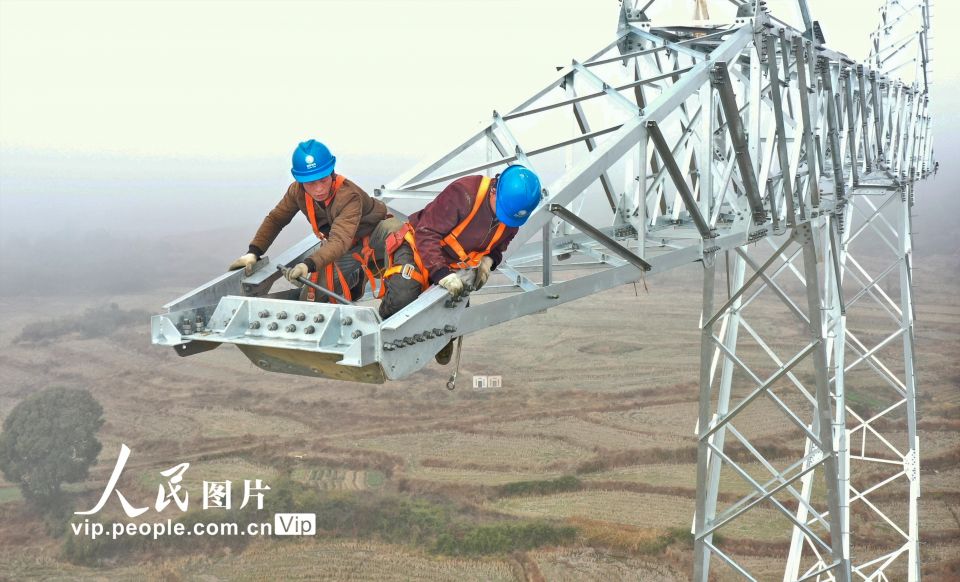 2022年1月31日,除夕,江西省吉安市永丰县潭城乡江下村,电力员工正在忙于组装电网铁塔。吉安市永丰县电网建设不停工,电力员工放弃春节假日休息,在野外寒风中坚守施工岗位。刘浩军摄(人民图片网)