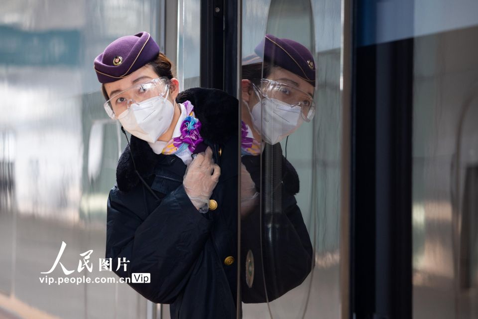 2022年1月31日,除夕,在南京火车站,C3157次列车长在岗位上工作。苏阳摄(人民图片网)