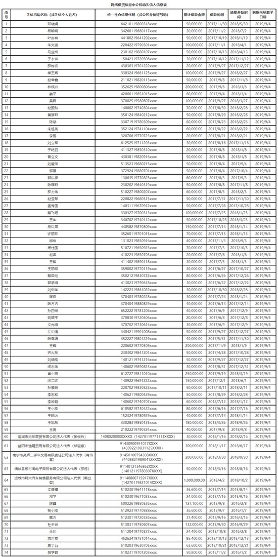 据公布的网贷信息中介机构失信人信息表显示,上述74名失信网贷借款人中,有5名是企业的法人代表,分别为运城市天年商贸有限公司法人代表张俊兵;益阳市逸晨贸易有限公司法人代表熊迎春;南宁市亮辉二手车交易有限责任公司法人代表肖传富;清徐县乐村淘电子商务有限公司法人代表罗栋;运城市韩大汽车销售服务有限公司法人代表韩立哲。