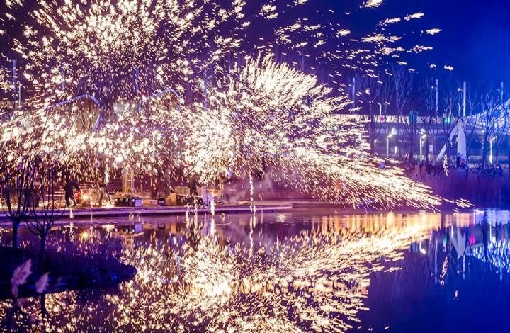 科创 河北邯郸:打铁花喜迎新春 2022-02-04 09:51:00 分享 2022年2月2日晚,河北省邯郸市邯郸园博园内上演打铁花表演。铁花飞溅的一瞬间,像巨龙腾飞,扶摇直上,又似天女散花,缤纷四射,现场观看的市民发出一阵阵惊叹声。聂长青摄(人民图片网)