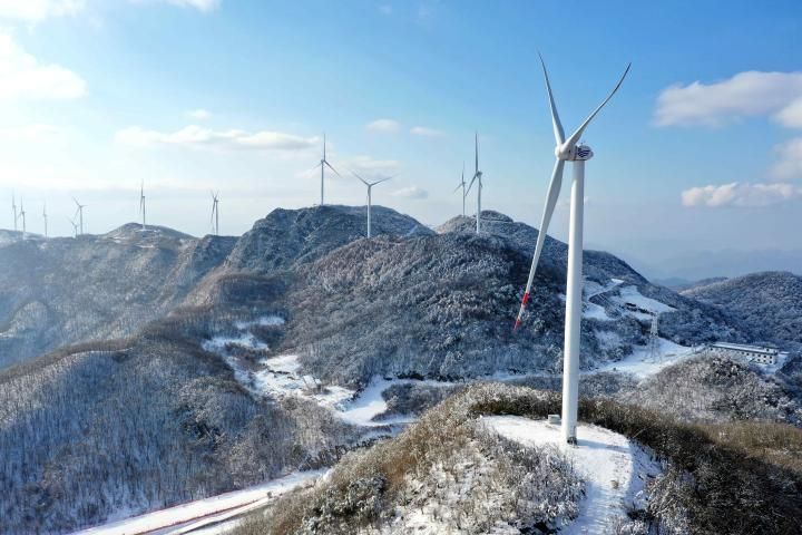 科创 湖北保康:风力发电 助力减排 2022-02-06 08:24:06 分享 平均海拔1800多米的湖北省襄阳市保康县后坪镇横冲风力发电场,风力发电机矗立山巅,叶片随风旋转,产生源源不断的绿色电能,助力低碳减排。杨韬摄(人民图片网)