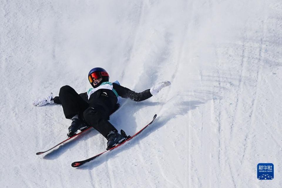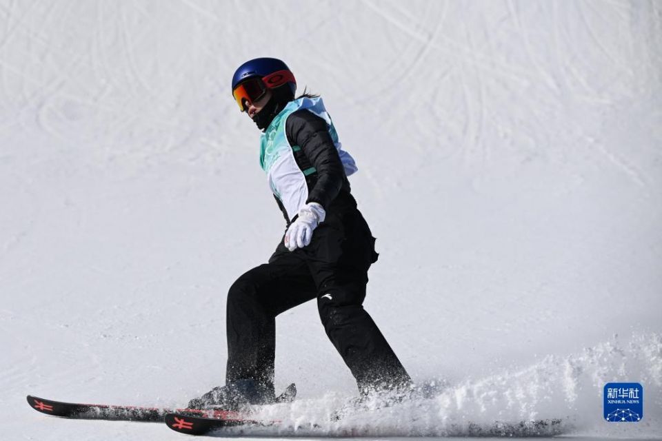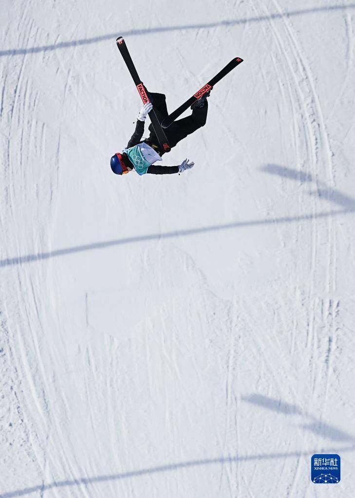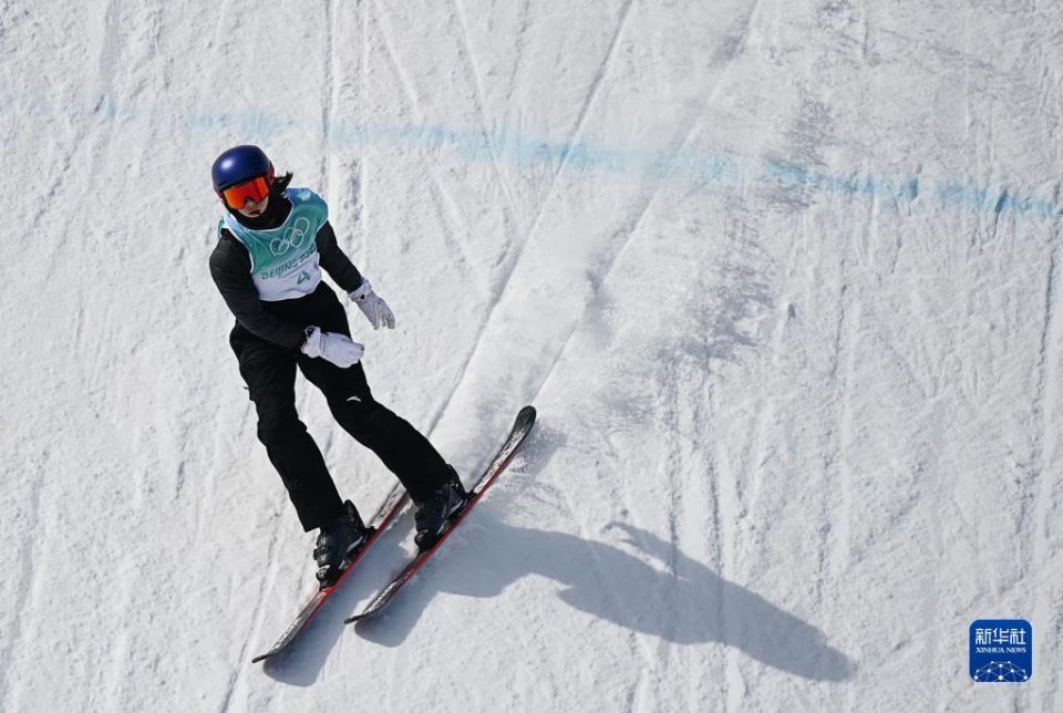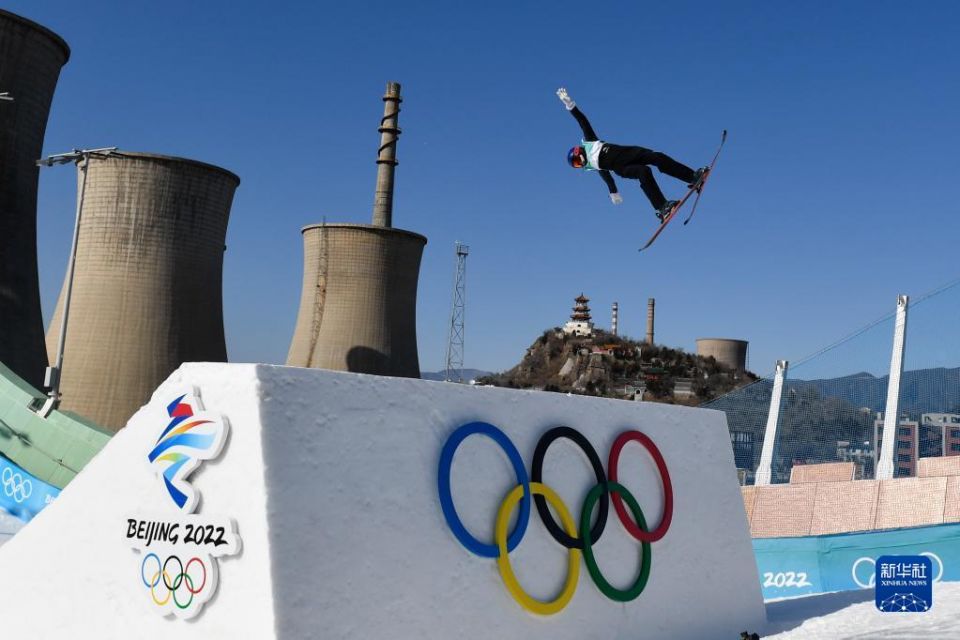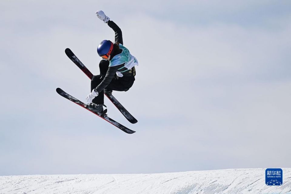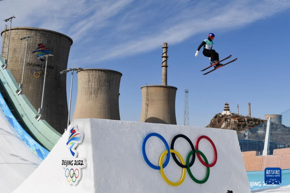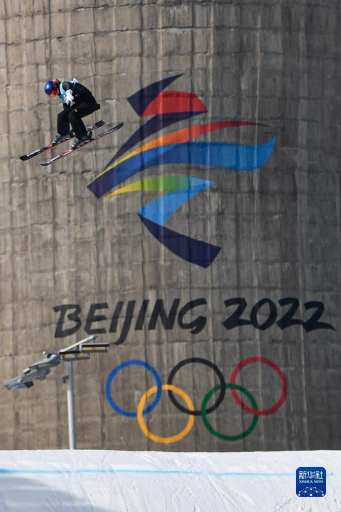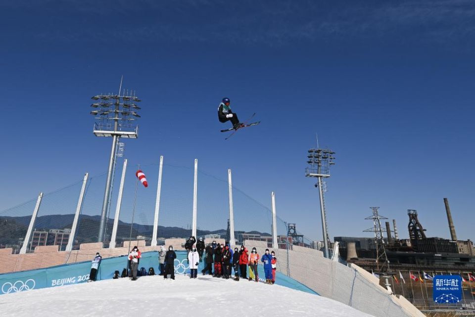 当日,中国选手谷爱凌在北京首钢滑雪大跳台进行赛前训练,备战即将开赛的自由式滑雪大跳台项目。