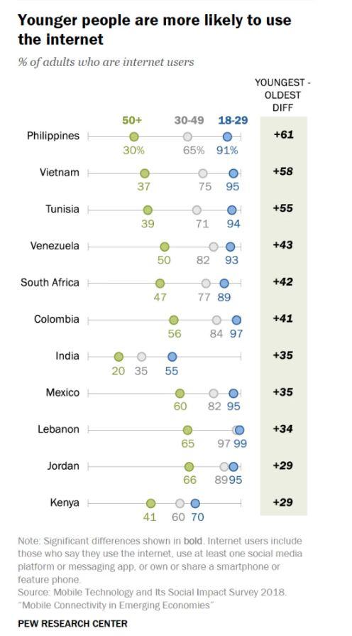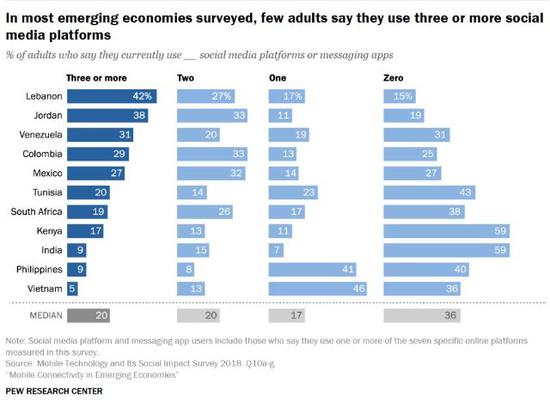 2018年,美国皮尤研究中心选取了越南、约旦、突尼斯、哥伦比亚、肯尼亚、黎巴嫩、南非、墨西哥、菲律宾、印度、委内瑞拉11个典型新兴和发展中国家为调查对象,跟踪调查其目前互联网使用情况。